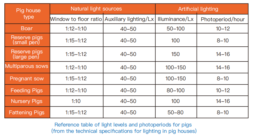 This specification provides reference table 1 for the setting of light levels for domestic pigs. Please make appropriate adjustments according to the specific light source spectrum application.